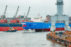 Готовность корпуса оценивается в 82%, параллельно идет монтаж оборудования и подключение к береговому электропитанию.